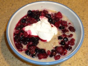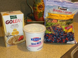 I like this meal because it’s easy to pack.  I empty the packet of oatmeal into a microwave safe dish and add the berries.  When I get to work I add the water and zap it.  I add the yogurt afterwards.  NOTE:  when you microwave oatmeal you need a much larger bowl than you think.  It overflows and can be a real pain in the patooties to clean up.  Take my word for it.