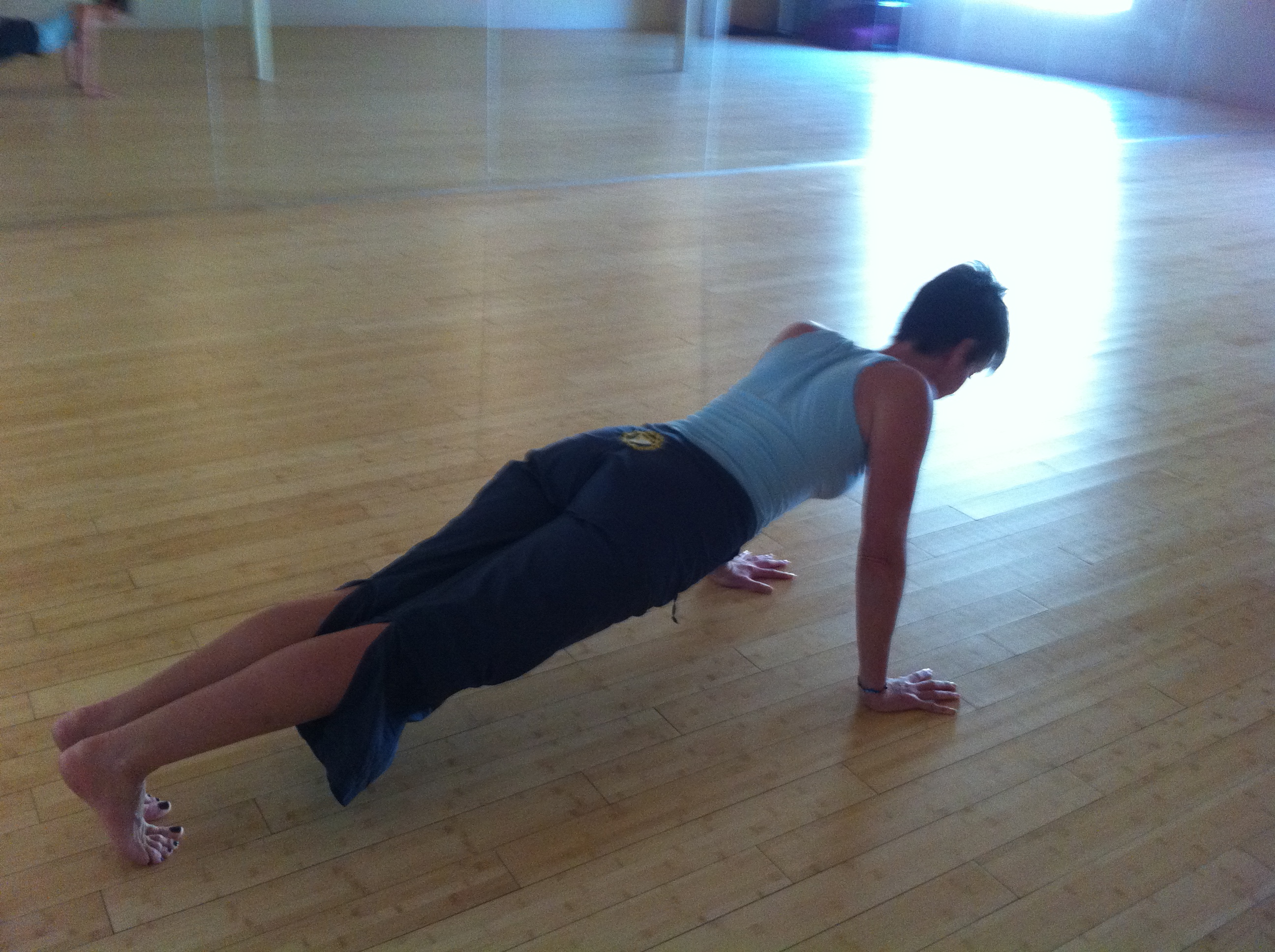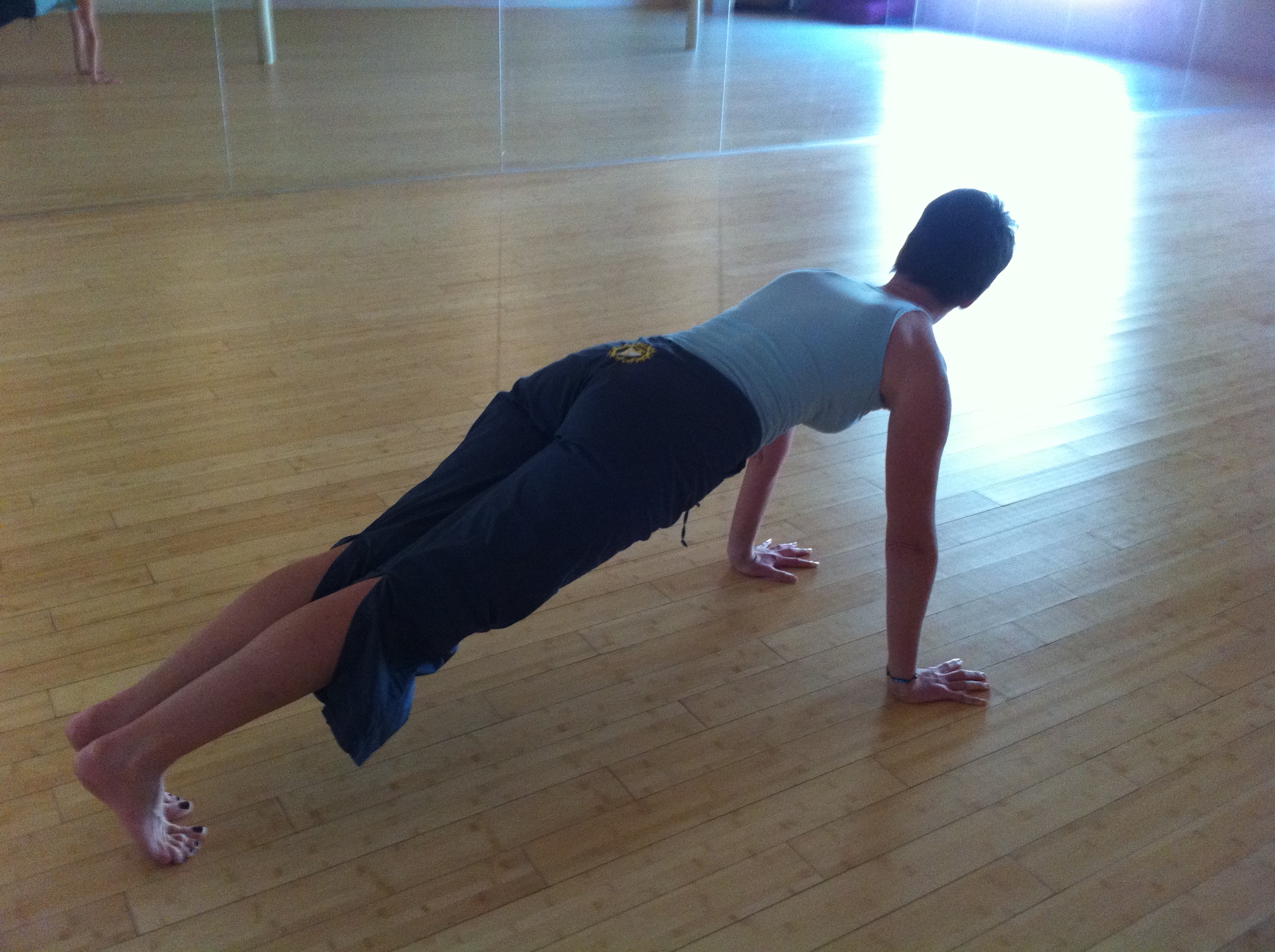 Start in standard regulation push-up position. If this is too difficult try modified push-up position (on your knees, body aligned), in table-top/all fours, or even against the wall. Without bending your elbows, think of pushing your hands deeper into the ground. Make your arms longer. This will cause your body to move closer to the ceiling. In a controlled manner (don’t collapse), shorten your arms again, causing your scapula to wing on your back. Do this all while keeping that perfect spinal alignment. And breathing. And sticking ’em out… Do 10. Or 25. See what you have in you!