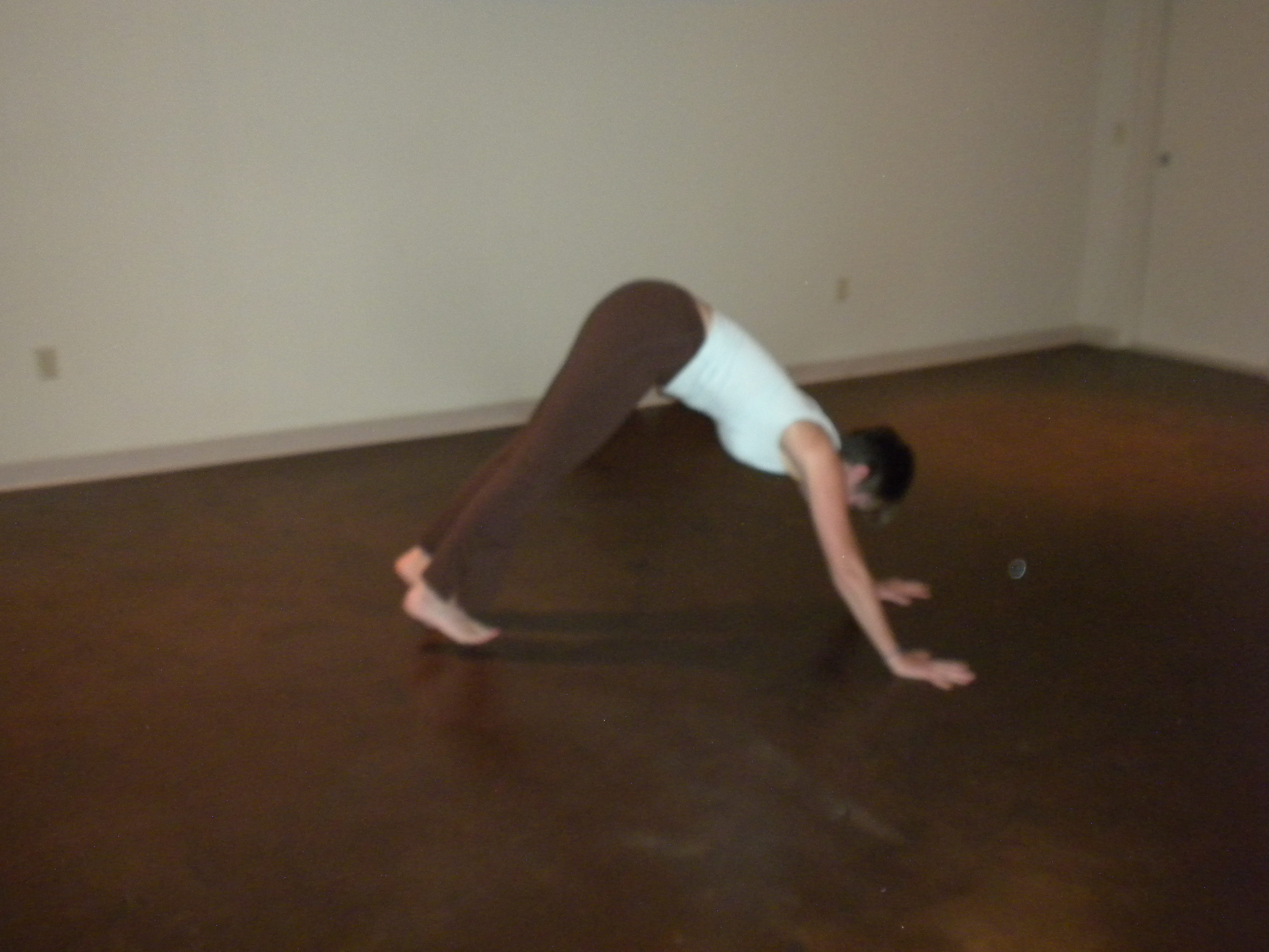 Begin by leaning forward, hands to floor. Keep your legs straight (but knees not locked). Start crawling forward with your hands untilyou’re in push-up position. If you